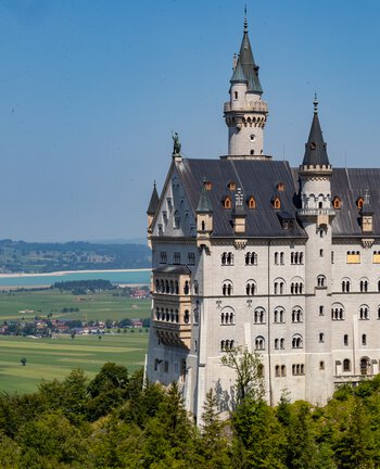 Schloss Neuschwanstein liegt rund 120 Kilometer südwestlich von München und ist damit ein beliebtes Ziel für Tagesausflüge. Laut der Bayerischen Schlösserverwaltung besuchen jährlich rund 1,4 Millionen Menschen Schloss Neuschwanstein, was es zu einer der meistbesuchten Sehenswürdigkeiten Bayerns macht. Die Innenräume, darunter der prunkvolle Thronsaal und das imposante Schlafzimmer, spiegeln die extravagante Persönlichkeit Ludwigs wider.