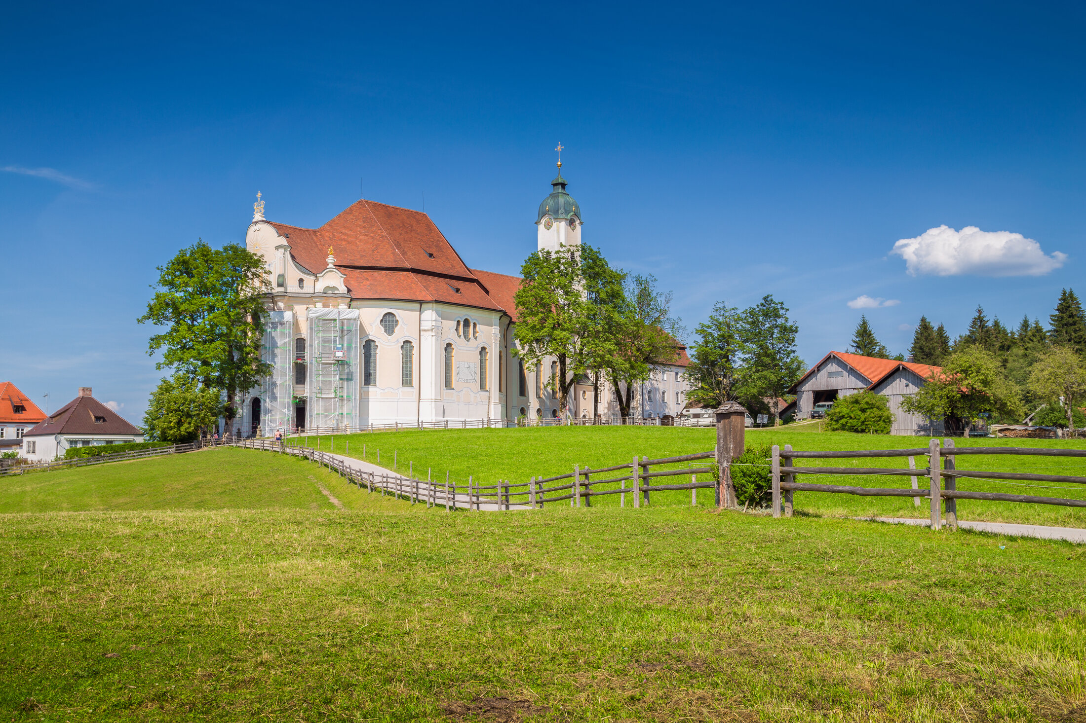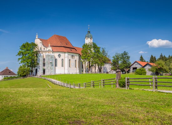 Vor der majestätischen Kulisse der Alpen steht die Wieskirche bei Steingaden – ein vollendetes Kunstwerk des bayerischen Rokokos. Die Brüder Zimmermann schufen hier zwischen 1745 und 1754 einen lichtdurchfluteten Innenraum, dessen Stuckverzierungen und Deckengemälde eine himmlisch-heitere Atmosphäre erzeugen.